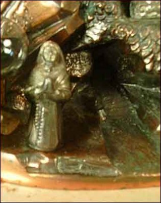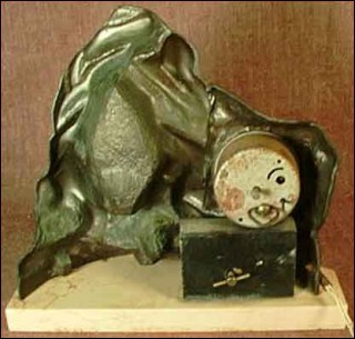 Alarm Clock with music clock in coppered spelter with our Lady of Lourdes made about 1940. The movement of the music box works the movement of the clock also only the handles are jammed. 9"7/8 width 9"7/8 tall.