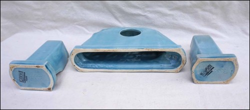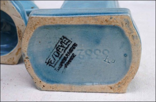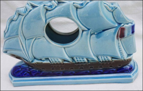 Voiller "trois mats" toutes voiles au vent, en céramique, avec ses deux accompagnements, de la célèbre manufacture de Sarreguemines exécuté vers 1920. Ce navire école bat pavillon français, dans sa voilure un emplacement pour un mouvement d'horloge. Dimension hauteur 17,8 cm, largeur 27 cm, profondeur 6,5 cm; pour les vases largeur 9,5 cm, hauteur 15,2 cm, profondeur 6,5 cm. Très bel état, le mouvement d'horloge est manquant.