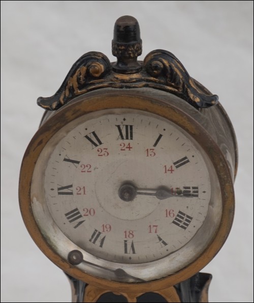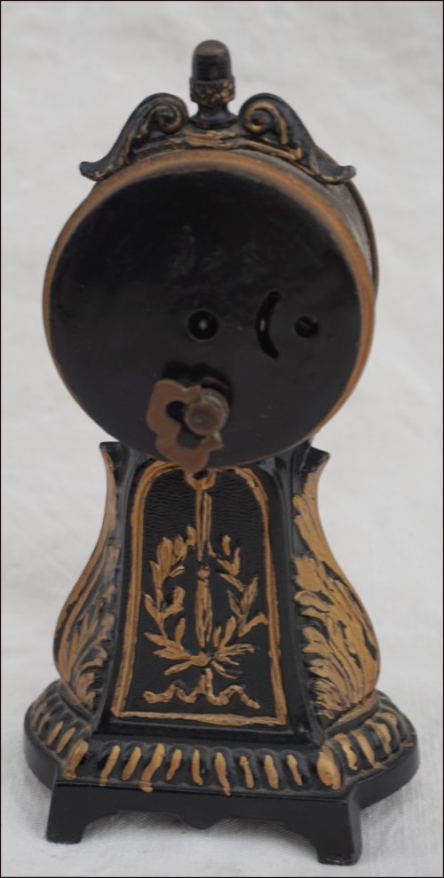 Swiss desk 8 days movement desk clock in black and gold hand painted iron case made by Aaron Nordmann St.-Imier, Switzerland registred the 16.12.1886. It's stamped on the back AN Depose. 5 7/8" (15cm) height, 3 1/8" (8cm) width and 2" (5cm) diameter of the movement. The movement is complete,oil stickly, and needs repair. The case is in good condition , the back has been re-painted as shown by the following pictures.