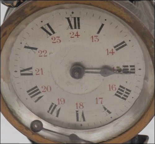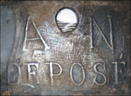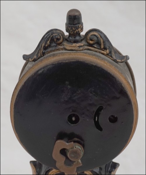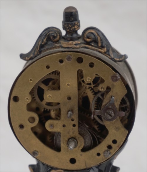 Pendulette suisse de bureau, boitier en fonte signée AN DEPOSE, Aaron Nordmann de St. Imier déposait le logo AN en 1886. Le mouvement est complet, englué par de l'huile. Bel état d'usage, revers repeint. Dans l'état. Hauteur 15 cm, largeur 8 cm, calibre du mouvement 5 cm.