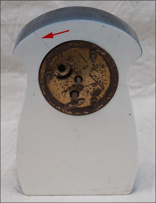 Pendulette en faience de Hollande, à décor égyptien, première moitié XXème. Dans l'état, cheveux et le mouvement ne fonctionne pas. Hauteur 16,5 cm, largeur 11 cm.
