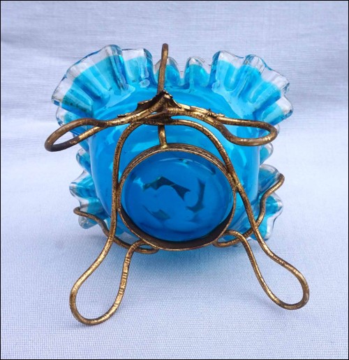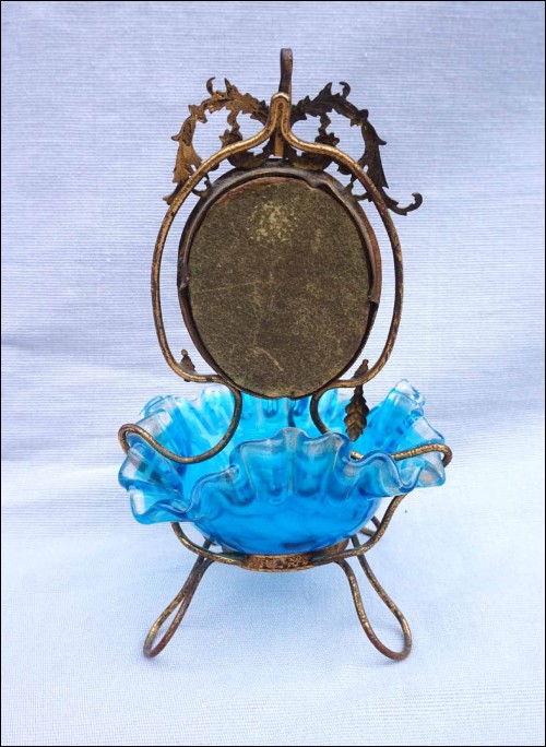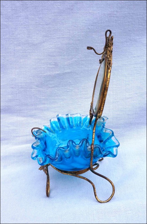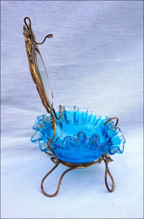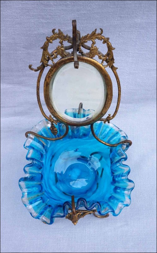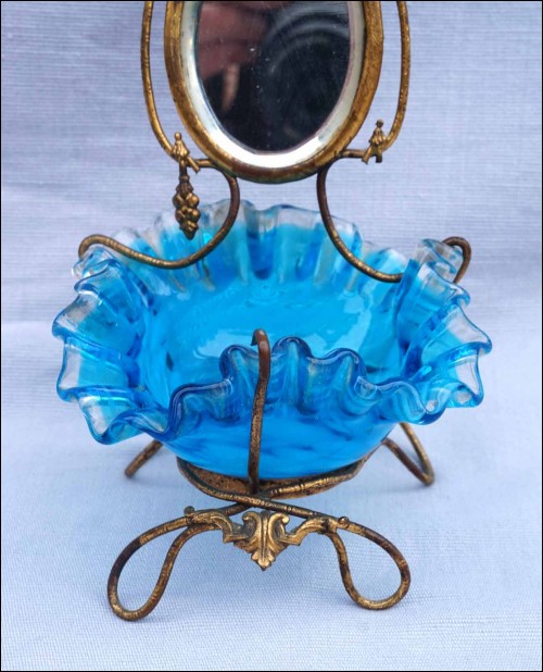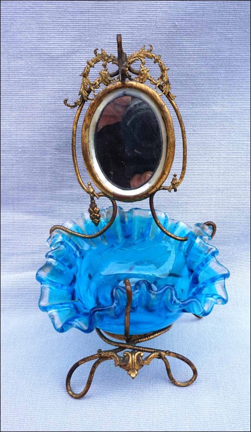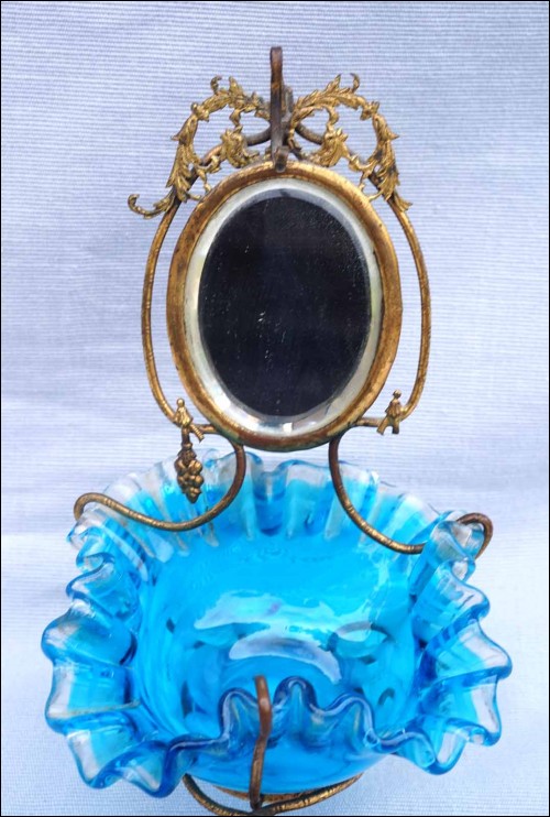 French watch holder with tidy in scalloped blue glass and gilt brass with oval mirror made late 19th century. 7" (17.7cm) height, 3 3/4" (9.5cm) width, 3 3/4" (9.5cm) depth, weight 8.18oz (232grams). Perfect condition only a small grape under the mirror is missing as shown by the following pictures.