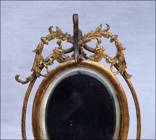Porte montre vide poche à support en cuivre doré , coupe en verre bleuté festonné et miroir ovale, vers 1880. Hauteur 17.7 cm, largeur 9.5 cm, profondeur 9.5 cm, poids 232gr. Très bel état, un décor de grappe de raisin manquant en bas du miroir.