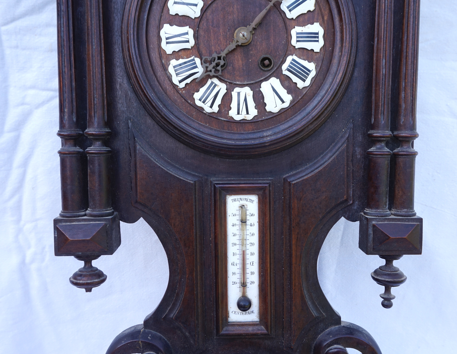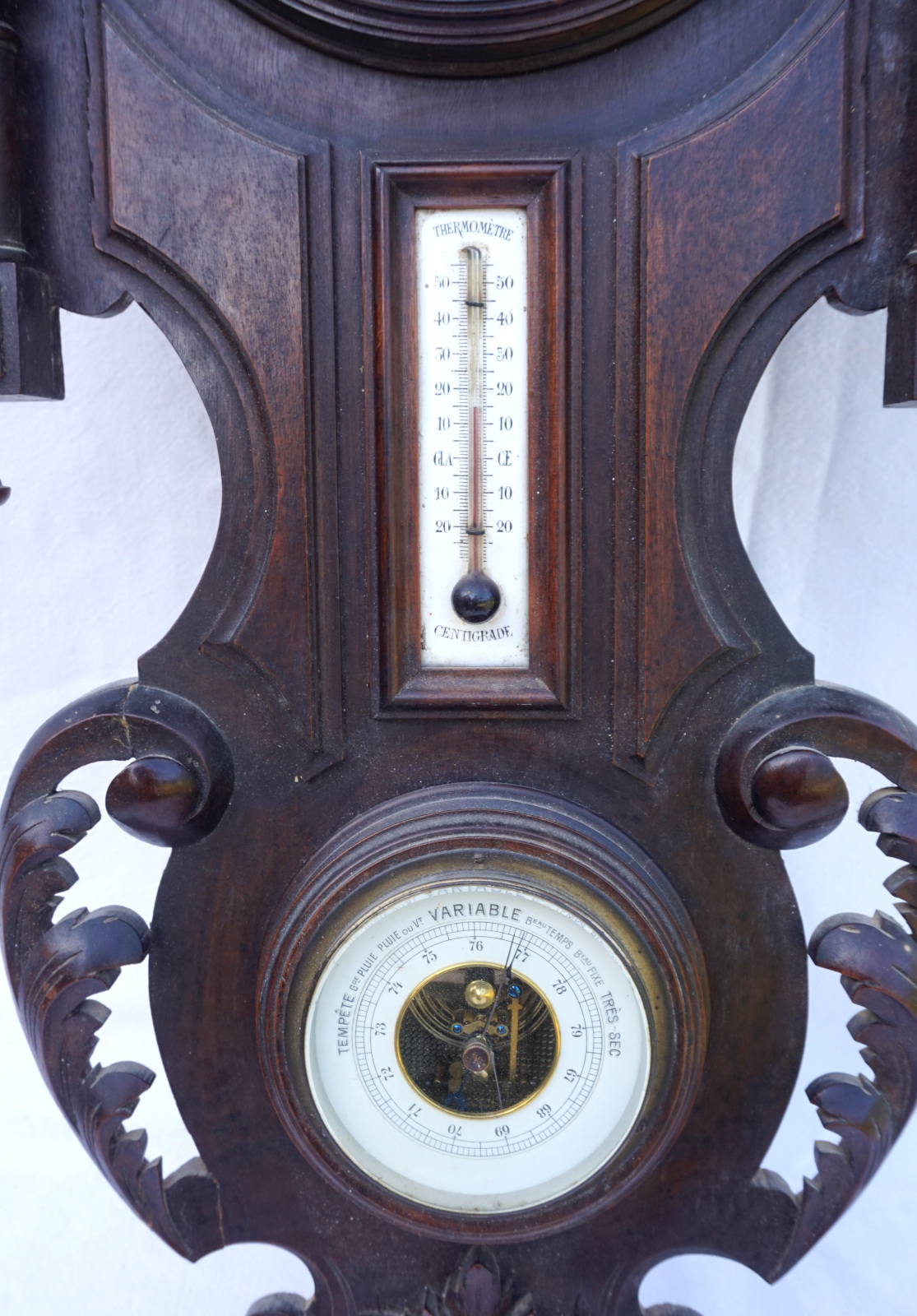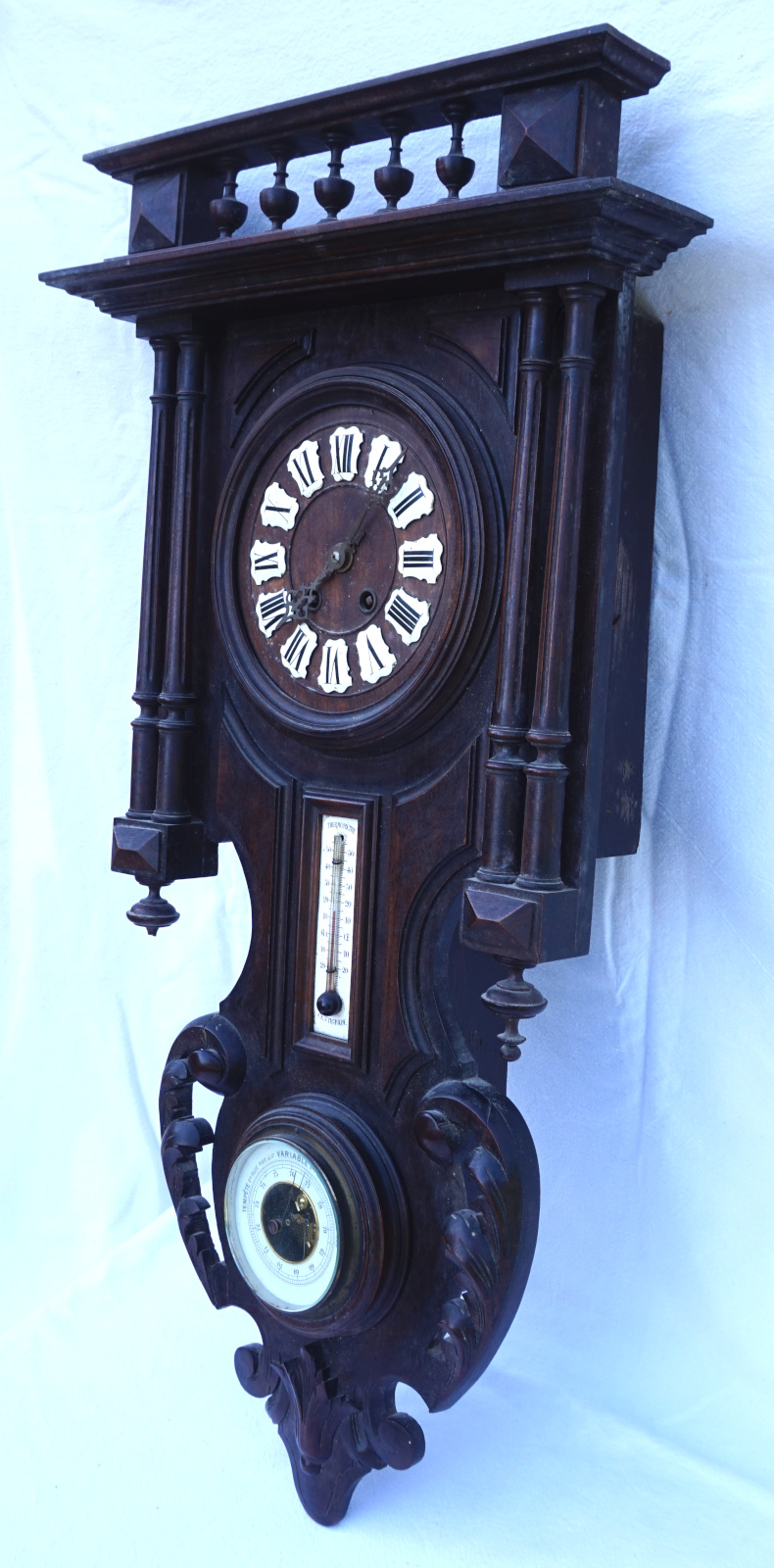 French wood carved wall clock with barometer and thermometer made during the 1880's. The 8 days movement strikes the hours and half on a gong. 33" (84cm) height, 17 1/8" (43.5cm) width, 6 1/2" (16.5cm) depth, weight 14.3lbs (6.5 kilograms). The clock (the key is missing), barometer and thermometer work perfectly, the wooden case is in good condition.