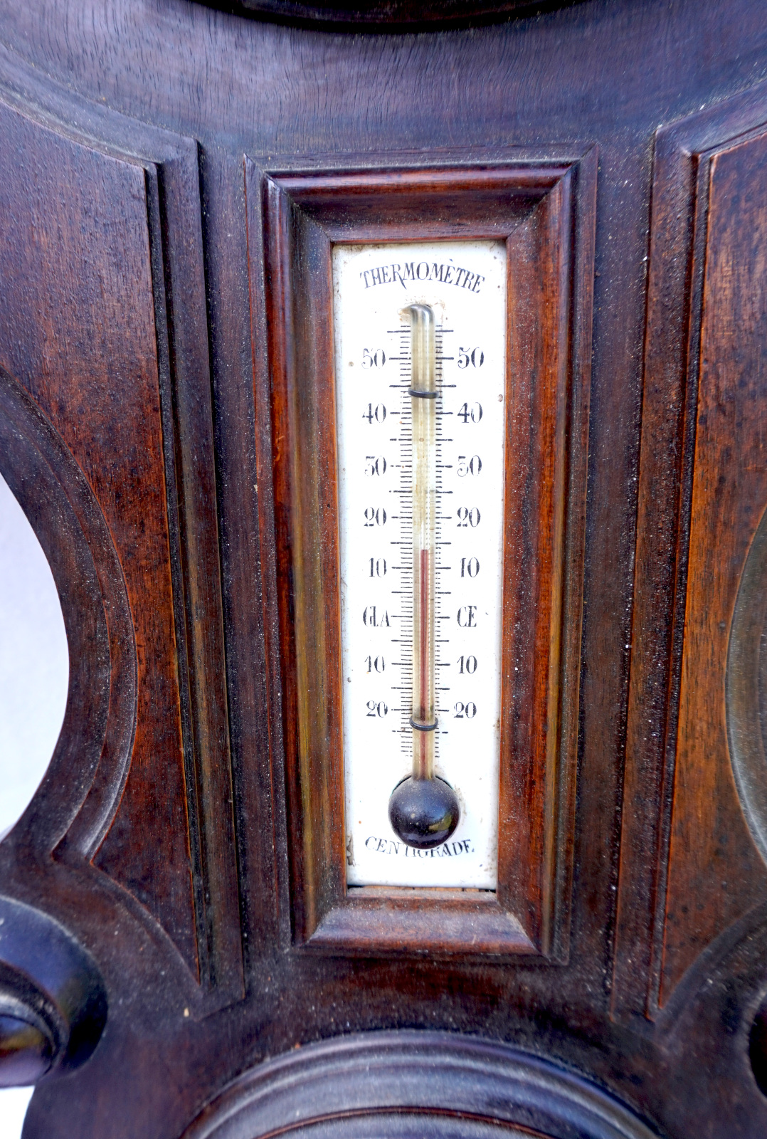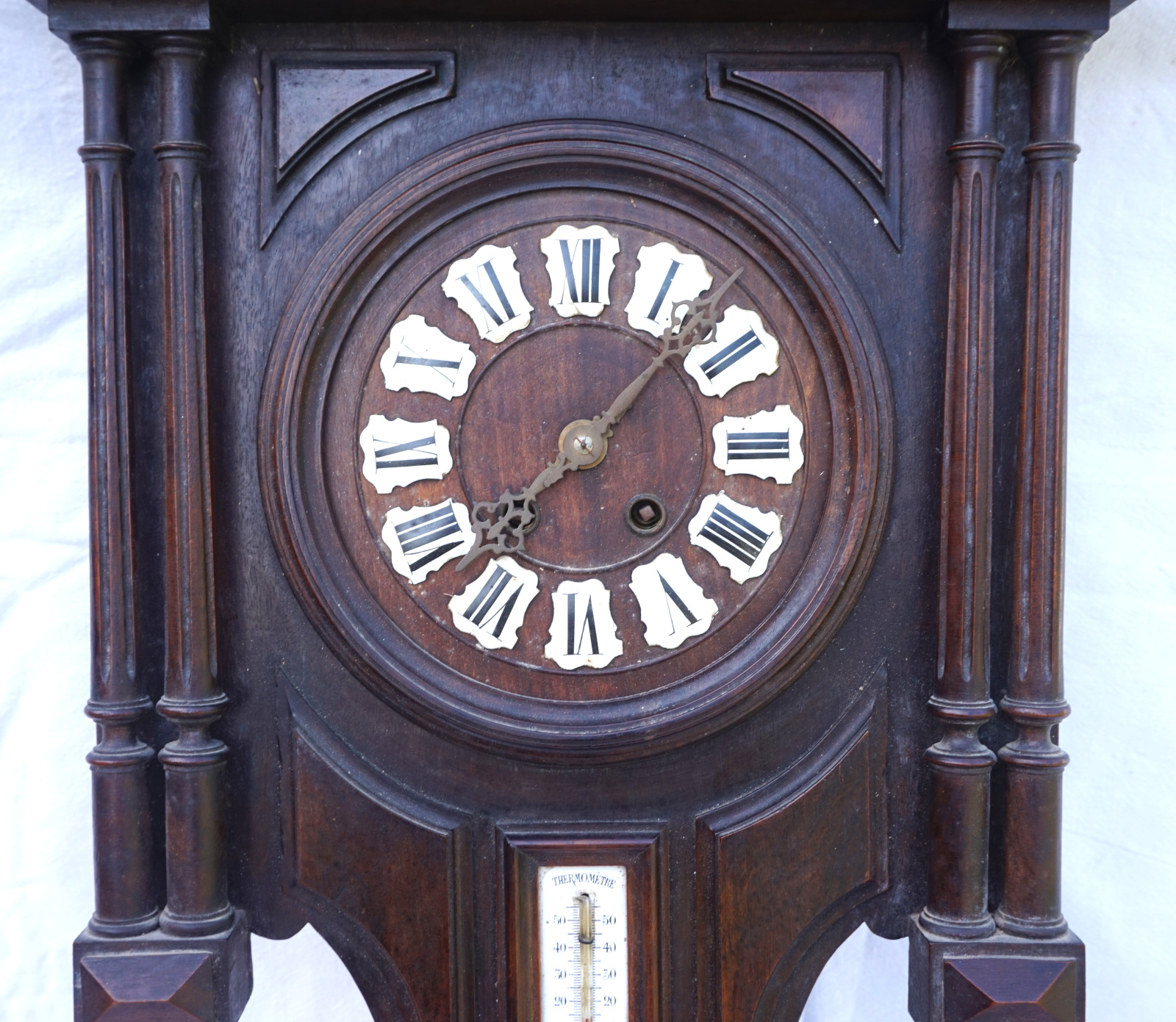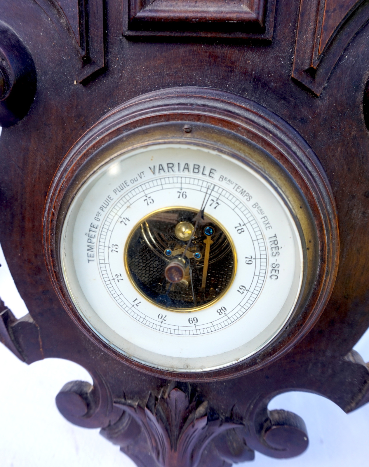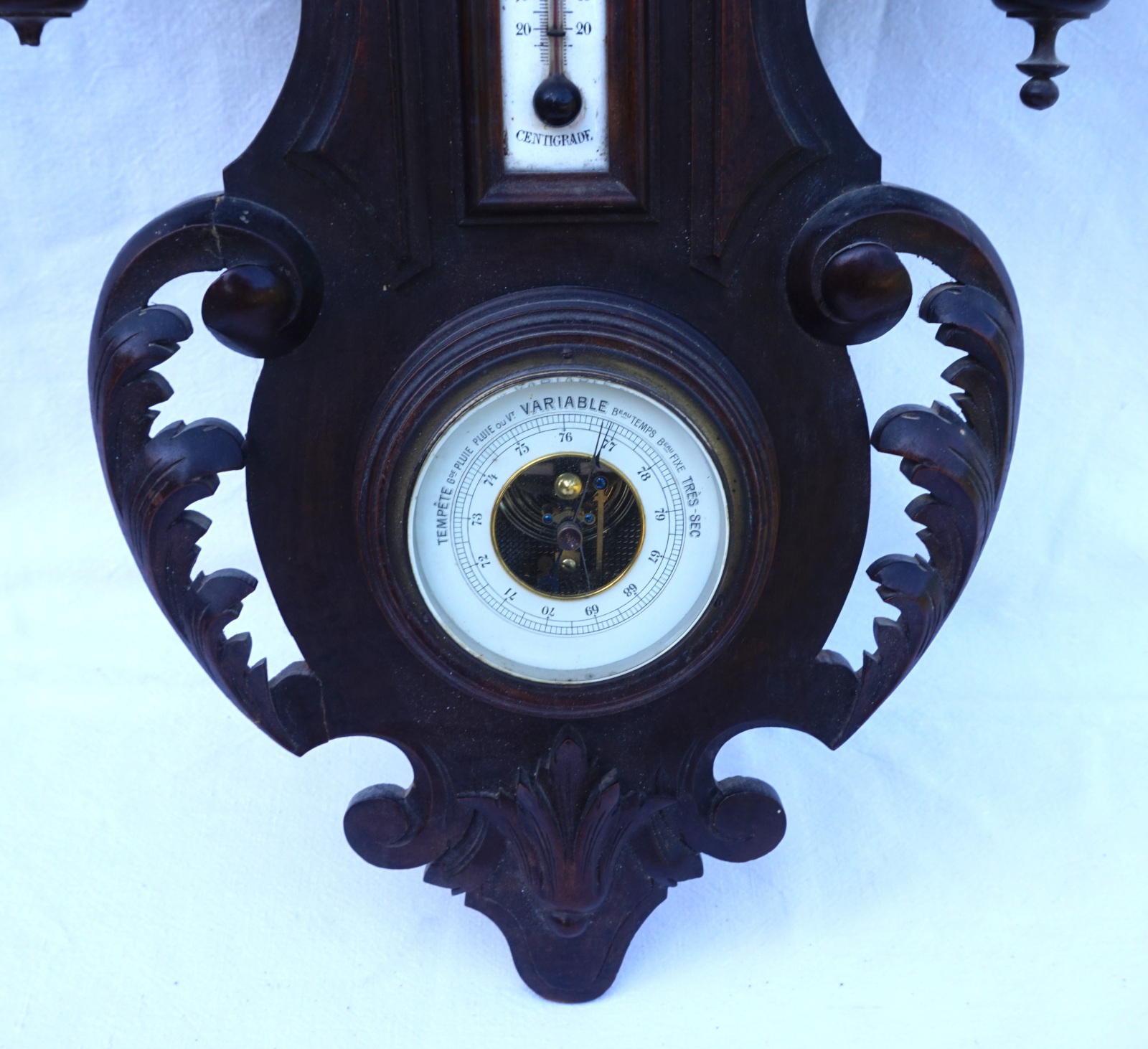 French wood carved wall clock with barometer and thermometer made during the 1880's. The 8 days movement strikes the hours and half on a gong. 33" (84cm) height, 17 1/8" (43.5cm) width, 6 1/2" (16.5cm) depth, weight 14.3lbs (6.5 kilograms). The clock (the key is missing), barometer and thermometer work perfectly, the wooden case is in good condition.