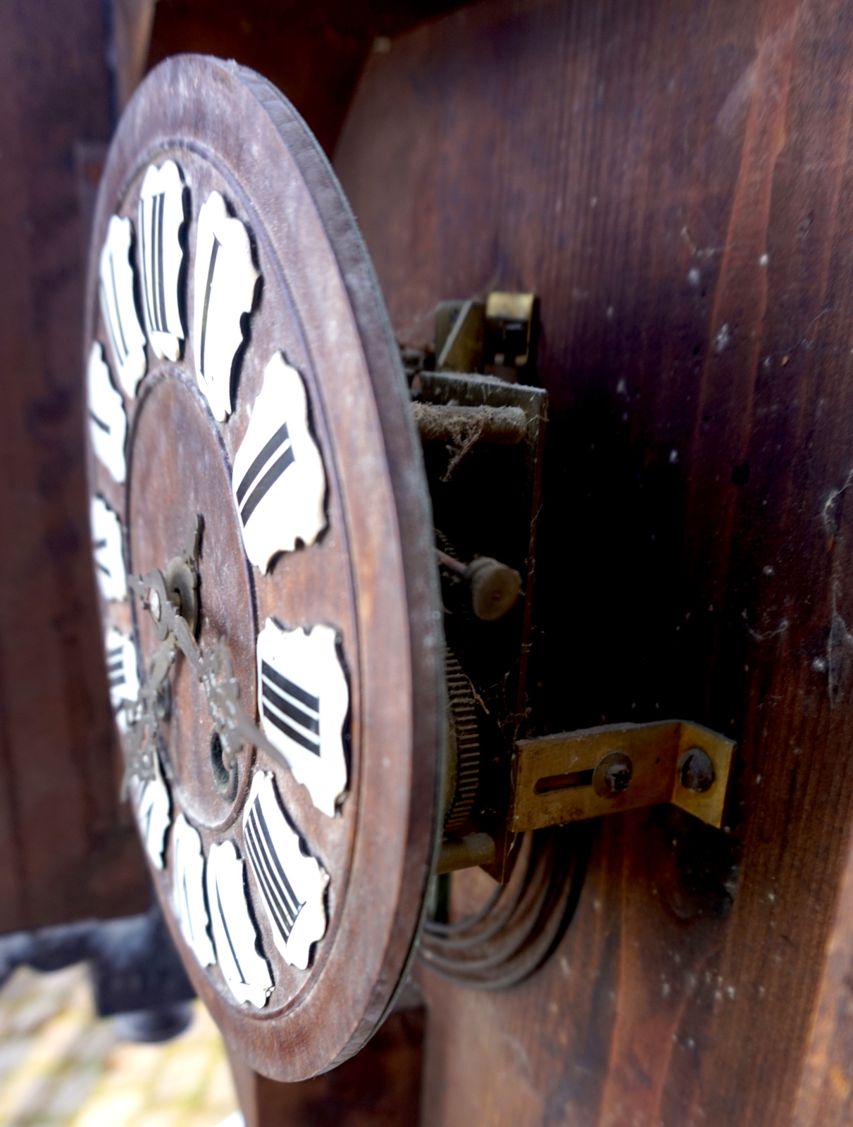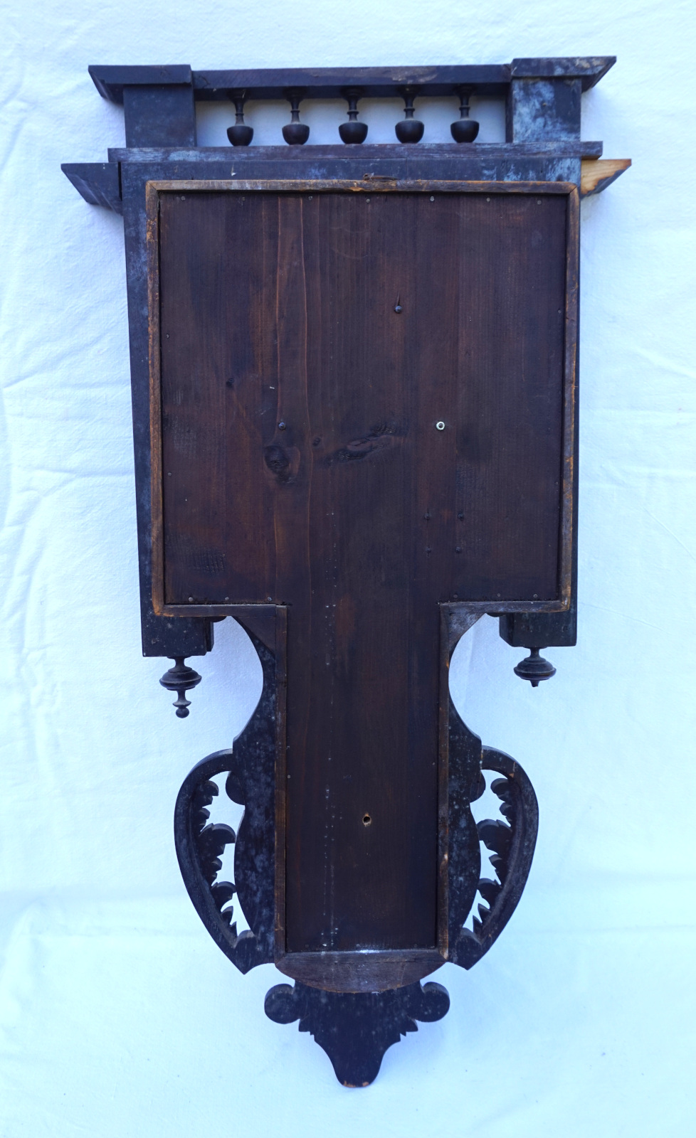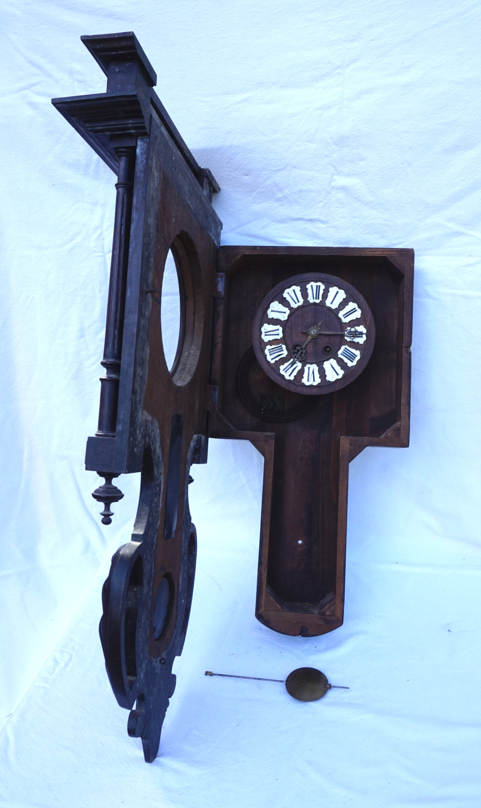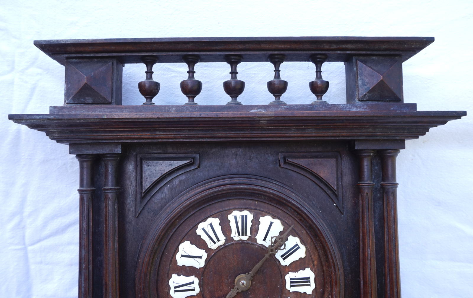 Pendule murale avec thermomètre et baromètre en bois tourné et sculpté vers 1900. Le mouvement de huit jours sonne sur un gong. Hauteur 84 cm, largeur 43.5 cm, profondeur 16.5 cm, poids 5.6 kg. Très bel état, le mouvement fonctionne bien ainsi que le thermomètre et le baromètre.