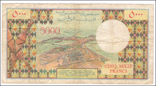 Billet de 5000 Francs République de Djibouti, type 1995, non daté, alphabet R.003, fil de sécurité, bande réfléchissante, sans texte de sécurité dans le cadre du billet. Bon état, papier craquant, pliures et trous d'épingle.
