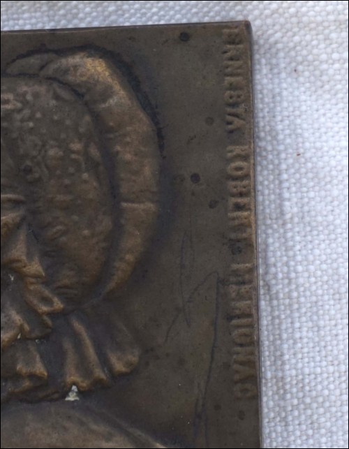 French bronze plaque medal named " Lorraine" made by Ernesta Robert Merignac in 1977. It's signed and stamped bronze with cornucopia. 2 1/2" (6.3cm) height, 1 3/4" (49cm) width, weight 4.656oz (132 grams). Good condition a slight mark on the top right corner on the reverse as shown by the following pictures.