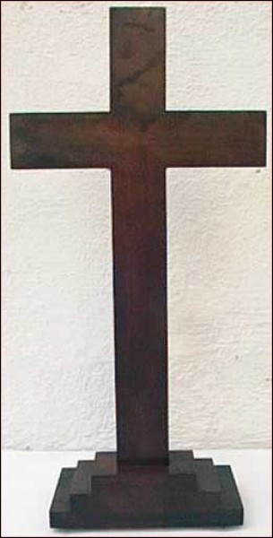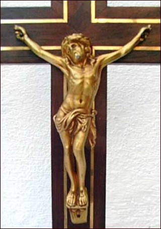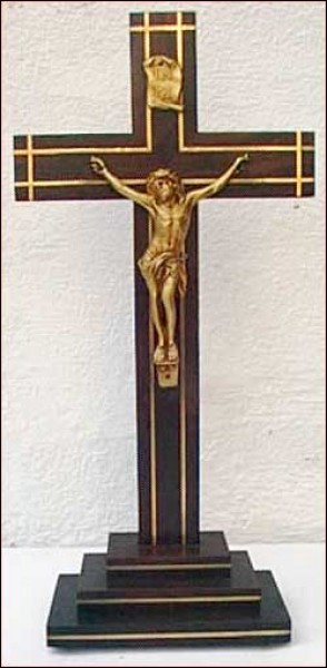 Crucifix d'autel, vers 1880-90. Il est en bois de palissandre massif avec incrustation de filets laiton, le Christ est en régule vernis or, au dessus de sa tête: le parchemin INRI. Bon état. Hauteur 33cm, largeur 16cm.