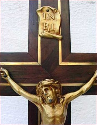 Altar Crucifix in gilt spelter on solid rosewood cross inlaid of brass filet made around 1880-90. The INRI symbol for Iesus Nazarenus Rex Iudaeorum, Jesus of Nazareth King of the Jews stands on the top. Good condition. 13" high 6"1/4 width.