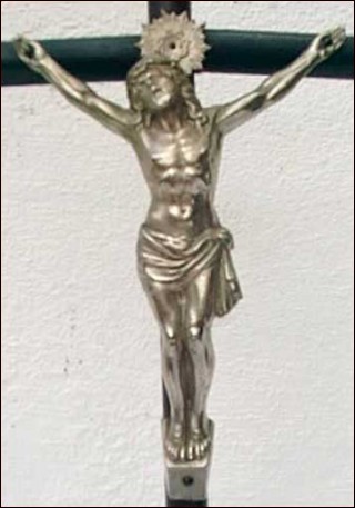Crucifix d'autel, souvenir de Sainte Anne d'Auray, vers 1910. Le Christ est en régule massif argenté, derrière sa tête la Parabole représentant l'Esprit Saint. Au dessus de la tête du Christ repose le parchemin INRI: Jésus de Nazareth Roi des Juifs, à ses pied la Mort, Jésus est au dessus du royaume des morts, il est ressuscité. Bon état. Hauteur 39cm, largeur 18cm.