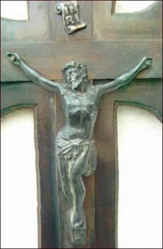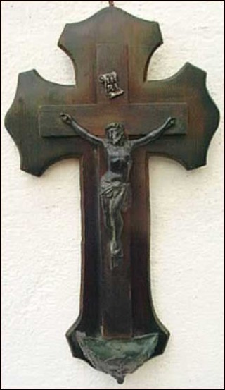 Antique holy water font with crucifix in pewter patina spelter on a rosewood cross made around 1870. The INRI symbol for Iesus Nazarenus Rex Iudaeorum, Jesus of Nazareth King of the Jews stands on the top and at the feet of Jesus Holy water font shell shaped. Good condition. 12" high 6"3/4 width.