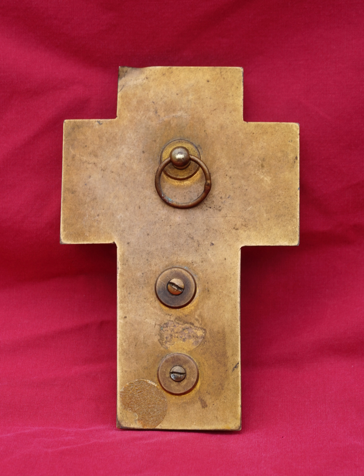 Crucifix avec son bénitier en émail cloisonné sur bronze et support en marbre, deuxième moitié du XIX° siècle. Hauteur totale 12.2cm, largeur totale 8cm, pour la croix hauteur 8cm, largeur 4.6cm. Bel état, fèle dans l'onys et choc dans un angle au dos.