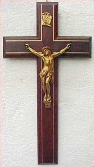 Crucifix en régule vernis or sur Croix en palissandre massif à incrustation de filets laiton, vers 1880. Au dessus de la tête du Christ repose le parchemin INRI: Jésus de Nazareth Roi des Juifs. Il est en bon état. Hauteur 35cm, largeur 19cm.