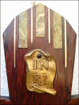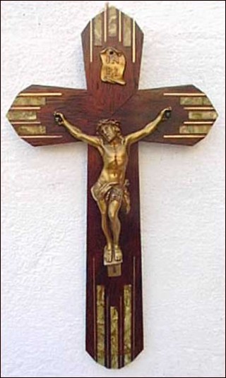 Crucifix in gilt spelter on solid rosewood cross inlayed of brass filet and onyx green bakelite made around 1920. The INRI symbol for Iesus Nazarenus Rex Iudaeorum, Jesus of Nazareth King of the Jews stands on the top. Good condition. It's signed Alren Depose.13"3/4 high 7"3/4 width.