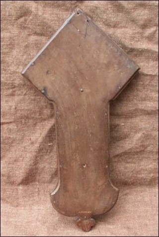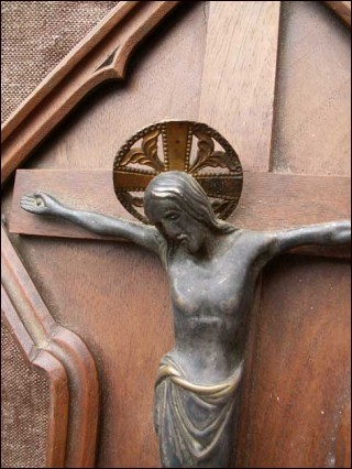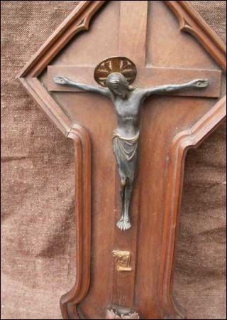 Crucifix sur plaque de style gothique vers 1910. La croix et son support son en noyer massif sculpté main, le Christ est en bronze argenté la parabole et le parchemin sont en bronze doré. Ce travail est signé Coulon et Roblot rue Caumartin à Paris. Bon "tat quelques usures. hauteur 44 cm largeur 22 cm.