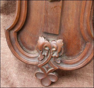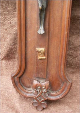 Crucifix in solid bronze on walnut plate in Gothic style made around 1910. the solid walnut is hand carving and the Christ is silver plate the parabol and INRI symbol are golden plate on solid bronze. Good condition. This work is signed Coulon and Rolot Paris. 17"1/4 high 8"3/4 width.