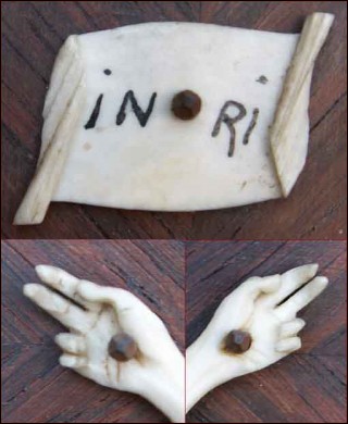 Antique French ivory corpus christ on rosewood crucifix made in Dieppe around 1870. The delicacy of the hand working and cutting of ivory is typical of the Dieppe work northern of France. The rosewood cross is inlayed on mahogany. At the top of the head of Christ stands the ivory symbol INRI for Jesus of Nazareth King of the Jews. Perfect condition only one thorn of the crown is missing . 11"7/8 high for the cross 4"7/8 tall and 3"7/8 width for the ivory Christ.