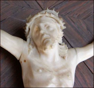 Crucifix en ivoire d'éléphant d'Afrique, sculpté entièrement à la main à Dieppe, ville célèbre pour ses ivoiriers. Le travail et la finition sont de grande finesse, la matière est bien choisie. Il repose sur une croix de palissandre des Indes plaqué sur acajou. Très bel état, juste une épine de la couronne a disparu. Hauteur de la croix 30 cm, hauteur de Christ 12.2 cm, largeur 9.6 cm