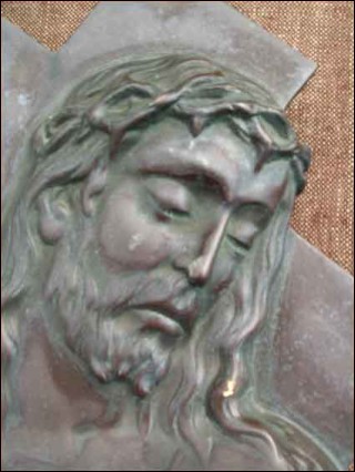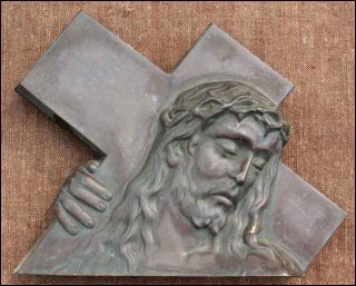 Plaque en bronze "Jésus porte sa Croix" vers 1900. Cet ornement d'extèrieur est en bon état. Hauteur 22.5 cm, largeur 24 cm.