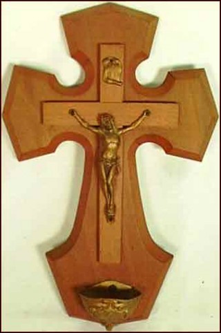 This holy water font in pear tree with Christ in golden spelter and at the foot of Christ font in golden spelter ornate of Louis XV shell has been made around 1910-1920. 10" tall 6"1/4 width. Good condition.