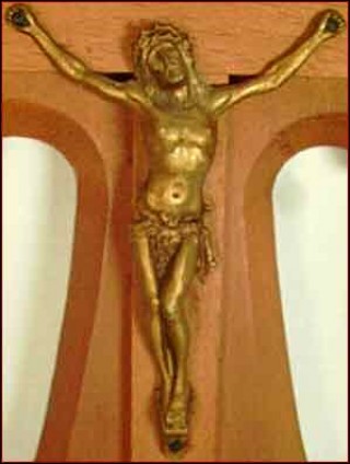 Bénitier mural sur bois de poirier blond ciré, le Christ est en régule massif doré, à ses pieds un bénitier de régule doré orné d'une coquille Louis XV né vers 1910-1920. Hauteur 25cm, largeur 16cm. Bon état.