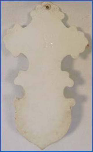 Bénitier sous crucifix en porcelaine blanche de Paris. Il est en bon état et porte sur son dos la marque MAP suivi du nombre 287, et a perdu ses rehauts de dorure, petites taches de rouille sur les angles du bénitier. Il est né sous le règne du roi Louis Philippe vers 1850. Hauteur 17 cm, largeur 9,5 cm.