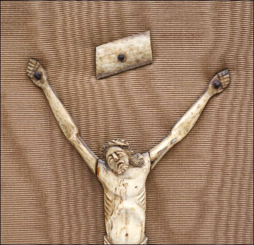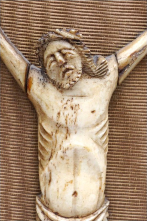 Christ en os encadré, XIXème siècle. Christ de prière des jansénistes, mouvance de la pensée de Saint Augustin développé par Cornélius Jansen. Dimensions du cadre : 37,5 cm par 28.5 cm, pour le Christ 18 cm par 10.2 cm.Très bel état.
