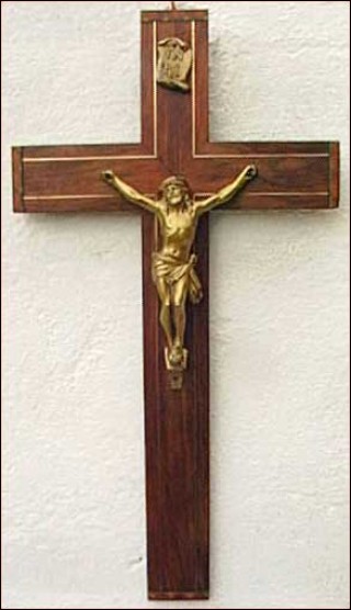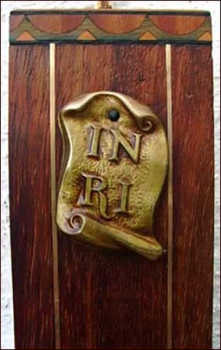 Crucifix in gilt spelter on Art Deco inlayed cross made around 1940. The INRI symbol for Iesus Nazarenus Rex Iudaeorum, Jesus of Nazareth King of the Jews stands on the top. Good condition only 2 small chips. 16" high 8"1/2 width.