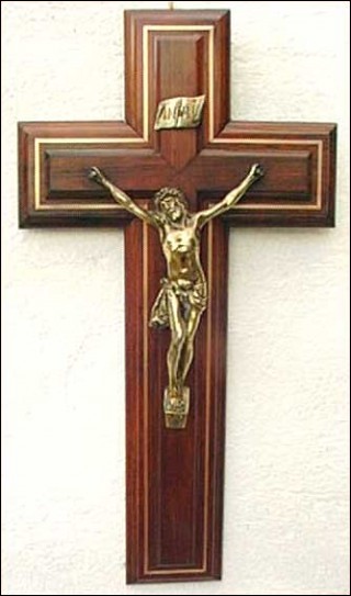 Grand crucifix en régule vernis or sur une double Croix en palissandre massif avec incrustation de filet cuivre, vers 1880. Au dessus de la tête du Christ repose le parchemin INRI: Jésus de Nazareth Roi des Juifs. Il est en bon état. Hauteur 40cm, largeur 21.5cm.