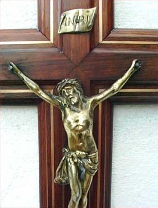 Crucifix in gilt spelter on solid rosewood double cross inlayed of brass filet made around 1880. The INRI symbol for Iesus Nazarenus Rex Iudaeorum, Jesus of Nazareth King of the Jews stands on the top. Good condition. 15"3/4 high 8"1/2 width.