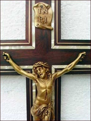 Large Crucifix in gilt spelter on solid rosewood cross inlayed of brass filet and bakelite made around 1920. The INRI symbol for Iesus Nazarenus Rex Iudaeorum, Jesus of Nazareth King of the Jews stands on the top. Good condition. 15"7/8 high 8"1/4 width.