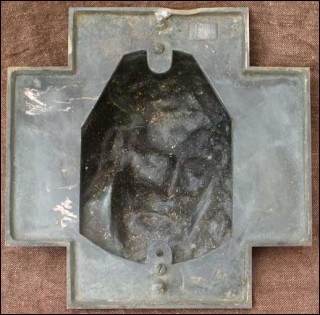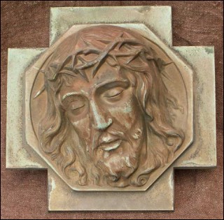 Grande croix représentant le tête du Christ couronné en bronze. Signé au dos M Thomas. 22.5 cm par 22.5 cm. Bon état.