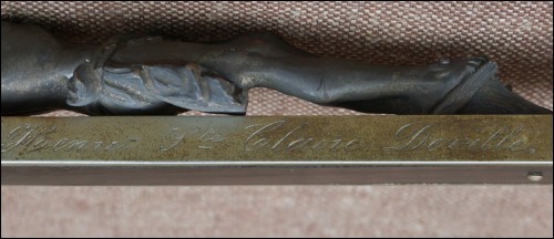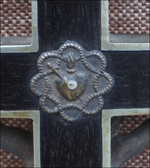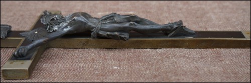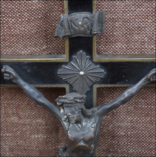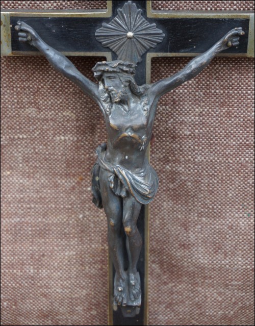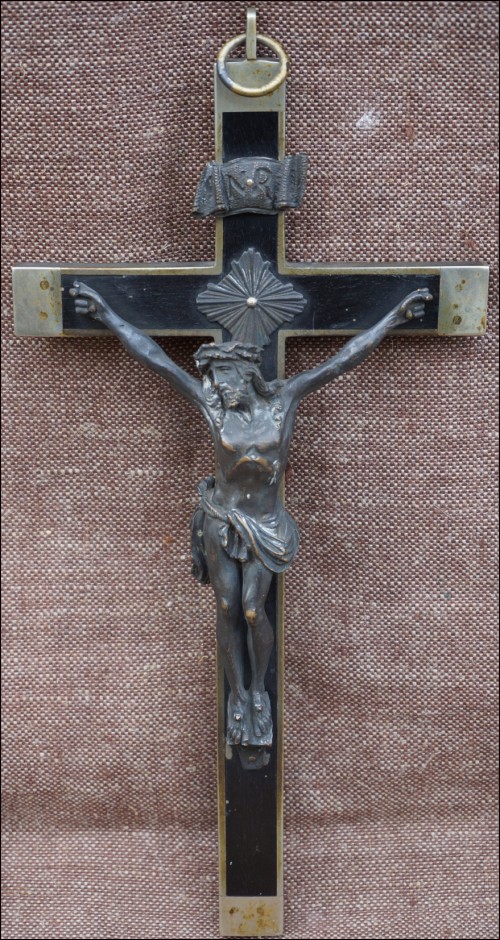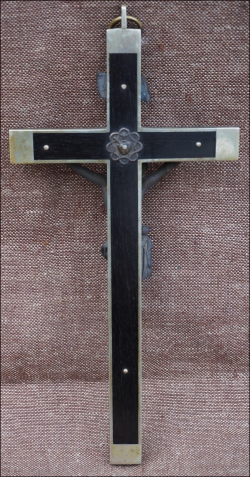 French large pectoral cross with Christ in silvered bronze on ebony cross made for the familyn of Henri St Claire Deville inventor of the aluminium. The cross with prophecy of Symeon on the back is engraved on one side Henri Ste Claire Deville 1894. Perfect condition. 9 5/8" height with the ring for hanging and 4 1/2" width.