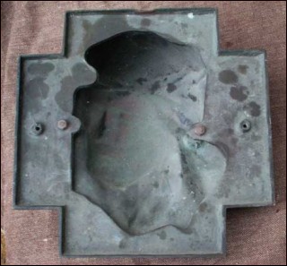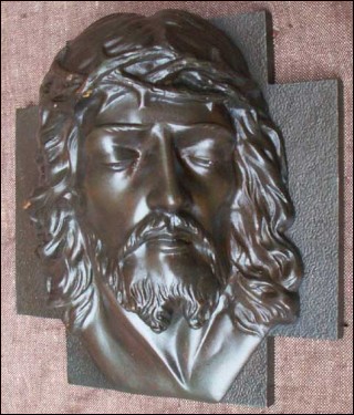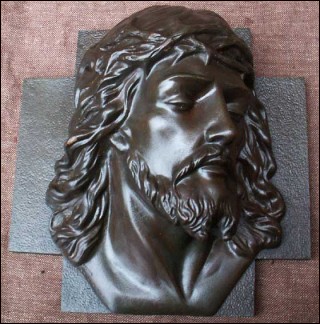 Head of Christ on Cross in solid bronze made around 1935 and signed X-Rani. Good condition only a small shock at the top of the cross.8"5/8 high 9" width.