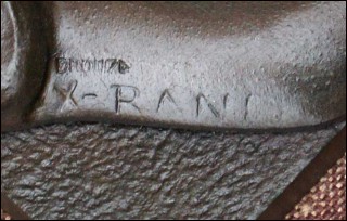 La tête du Christ sur la croix, sculpture en bronze signé x-Rani, vers 1935. L'oeuvre est en bel état, lègers accidents de patine, un petit choc sur le haut de la croix. Hauteur 22 cm, largeur 23 cm.