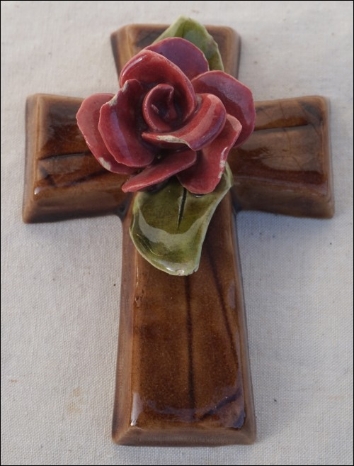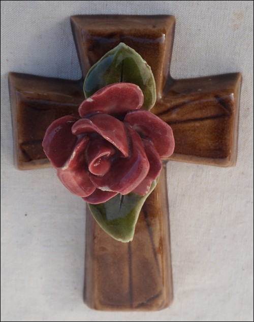French wall crucifix with rose in relief enameled faience made probably by Sarreguemines during the 1900's. 4 7/8" height 3 5/8" width. Good condition, a few tiny chip on the rose as presented on the following pictures.