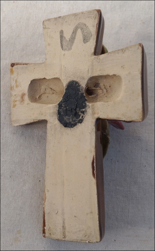 Crucifix murale de chevet en barbotine, vers 1900, que nous pensons de Sarreguemines. Bel état, petites égrenures. Hauteur 12,4 cm, largeur 9,3 cm.