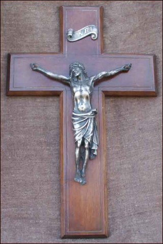 Wall crucifix in walnut cross with Christ in silvered bronze with INRI at the top of Christ made during the 19th century. Perfect condition. 10"3/4 high for the cross and 5"3/8 high for Christ.
