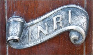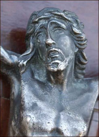 Christ en croix, le Christ vivant et couronné est en bronze argenté du XIXème siècle, son visage est miséricordieux, son corps est celui d'un pèlerin, jambes allongées et pieds larges. au dessus de sa tête le parchemin INRI. Il repose sur une croix en bois de noyer des années 1940. Ce crucifix mural est en bel état. Hauteur de la croix 47.5 cm, du Christ 23.5 cm.