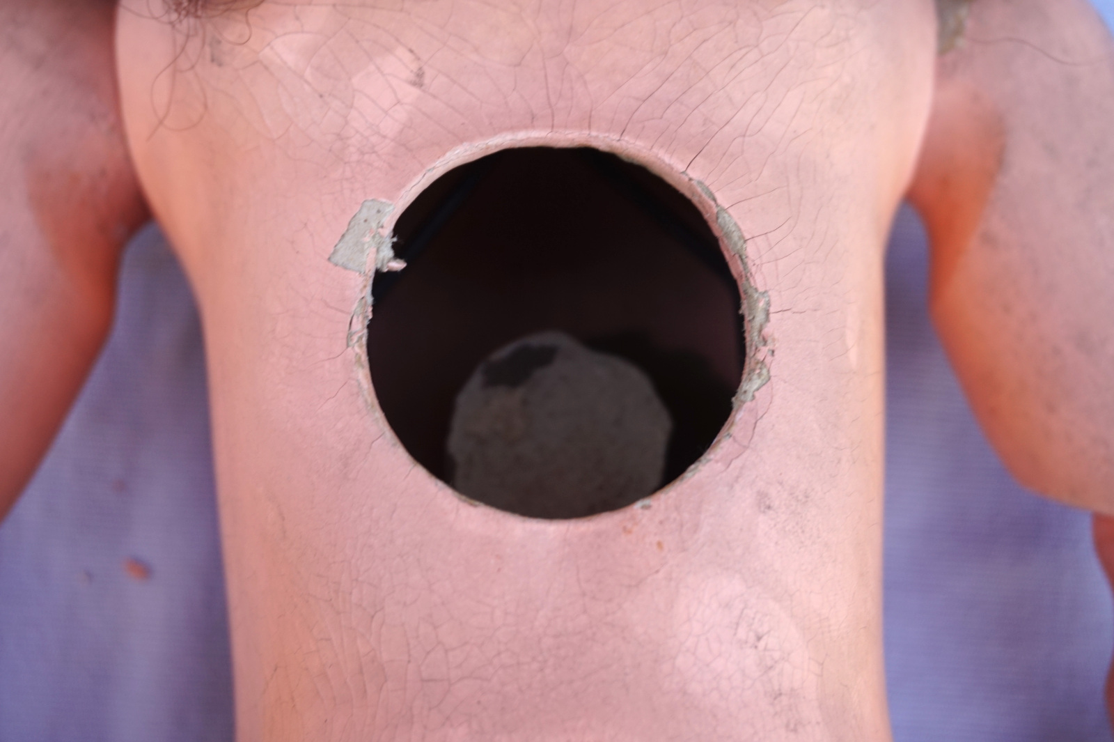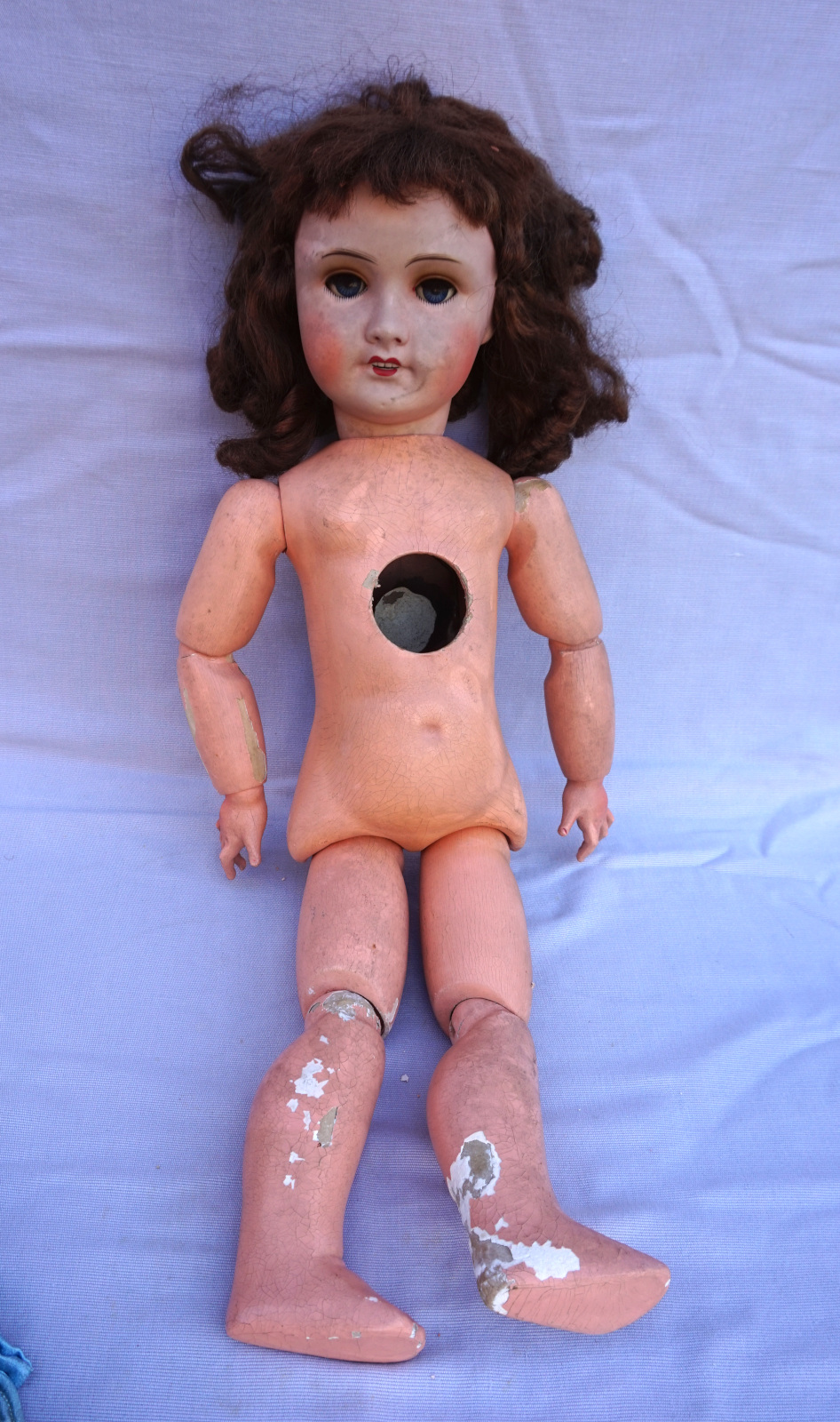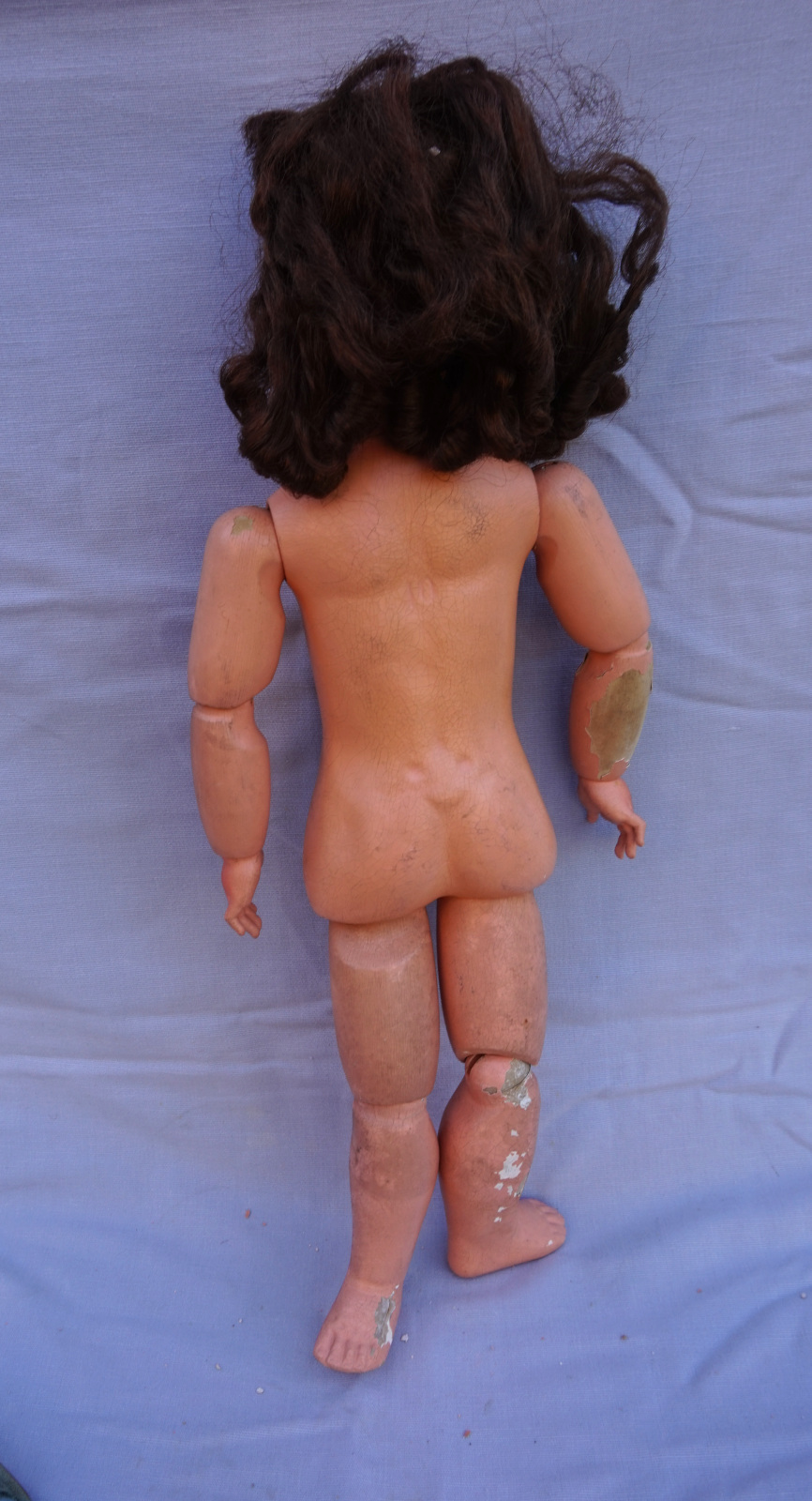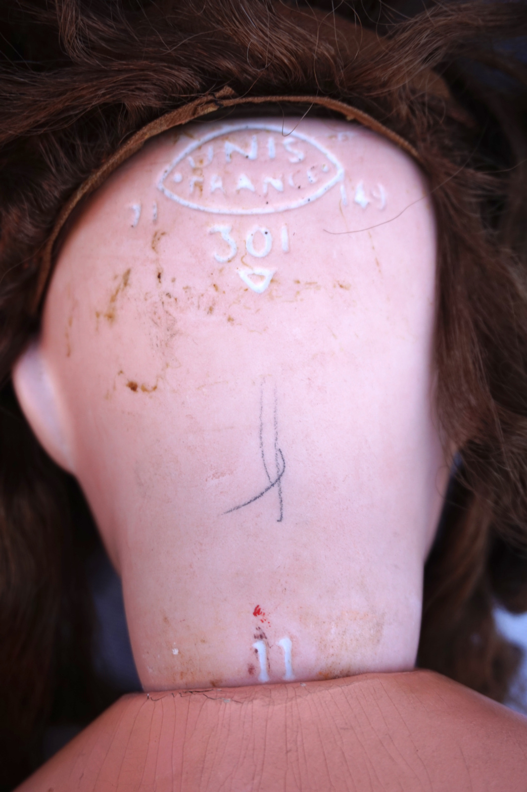 Poupée Unis France à tête porcelaine, taille 11, yeux dormeurs et bouche ouverte sur un corps à mécaniisme ( manquant) taille 10, vers 1920. Marquée UNIS FRANCE 71 149 301 (moule) 11 (taille), corps 10. Hauteur totale 59.5 cm. Très bel état, nous ne l'avons pas nettoyée.