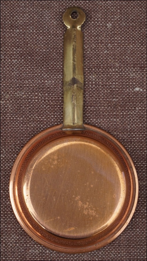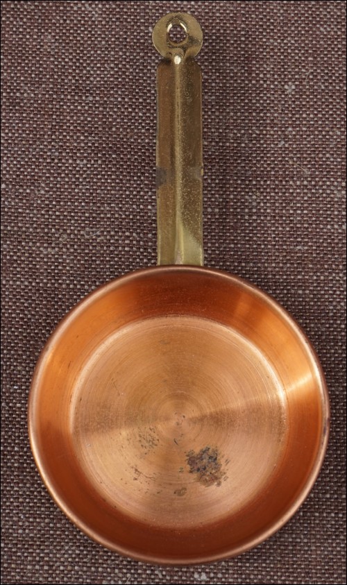 Batterie de cuisine miniature en cuivre pour une maison de poupée vers 1960. Bel état général, une tache sur le vernis de la poêle et la bassine à confiture est usagée. Hauteur de la plus grande pièce 7,5 cm.