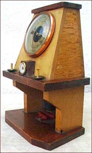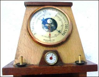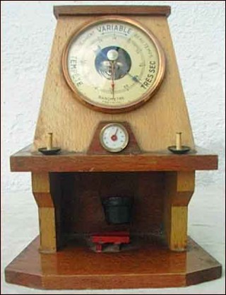 Cheminée de la maison de poupée en bois ornée pour son manteau d'un baromètre, vers 1950. Elle est agrémenté d'une fausse pendule, de deux bougeoirs et d'un chaudron de bois. Elle est en bon état. Hauteur 19 cm.