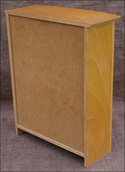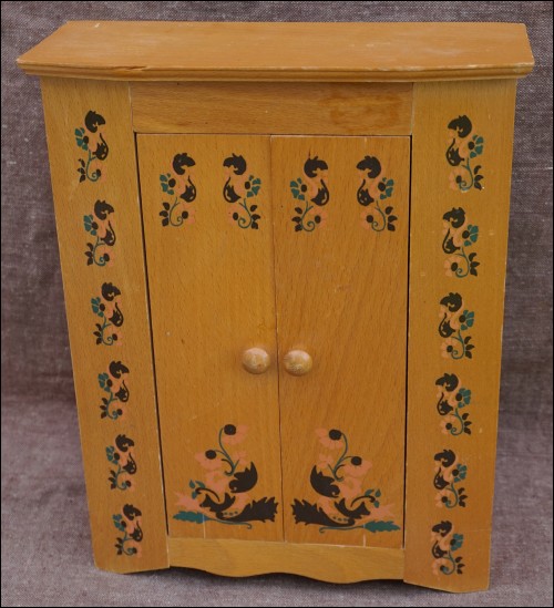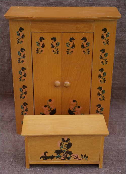 Vintage doll bedroom furniture an armoire and a toy trunk in wood with colored stencil decor made in France during the 1970's. The wardobe opens with 2 doors on a shelf and a rod. The armoire measures : 10 1/4" width 8 7/8" height 4 1/2 depth and for the toys chest : 7 1/2" width 4" height 3 3/8" depth. Good condition, only a little damage on the corniche, a part of the shelf is missing for the aroire, the toy chest is in perfect condition as presented on the following pictures.