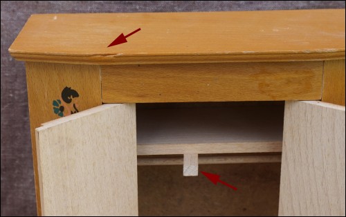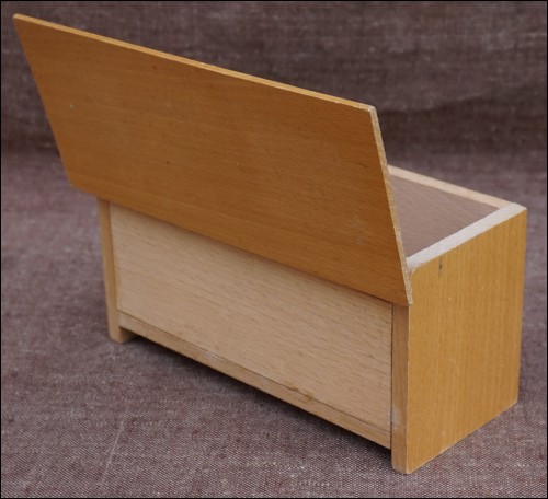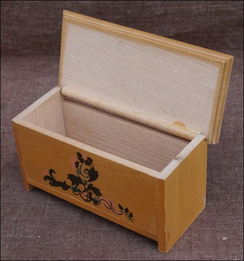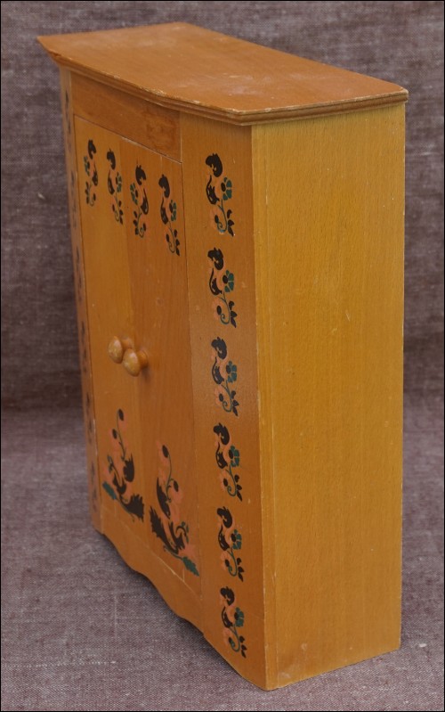 Armoire de poupée avec son coffre à jouets des années 70's. Ensemble en hetre vernis décoré au pochoir d'éléments floraux. La façade de l'armoire est à pans coupés, elle ouvre par deux portes sur une tablette et une tringle. Bel état général, accidents en corniche, manque une partie de tablette, tache de vernis en haut à droite. Pour l'armoire: hauteur 22,5 cm, largeur 26 cm, profondeur 11,5 cm; pour le coffre à jouet: hauteur 10 cm, largeur 19 cm, profondeur 8,5 cm.