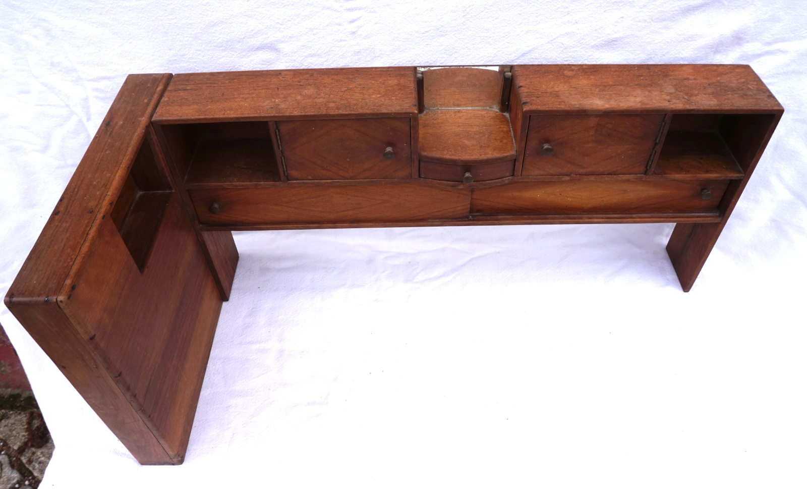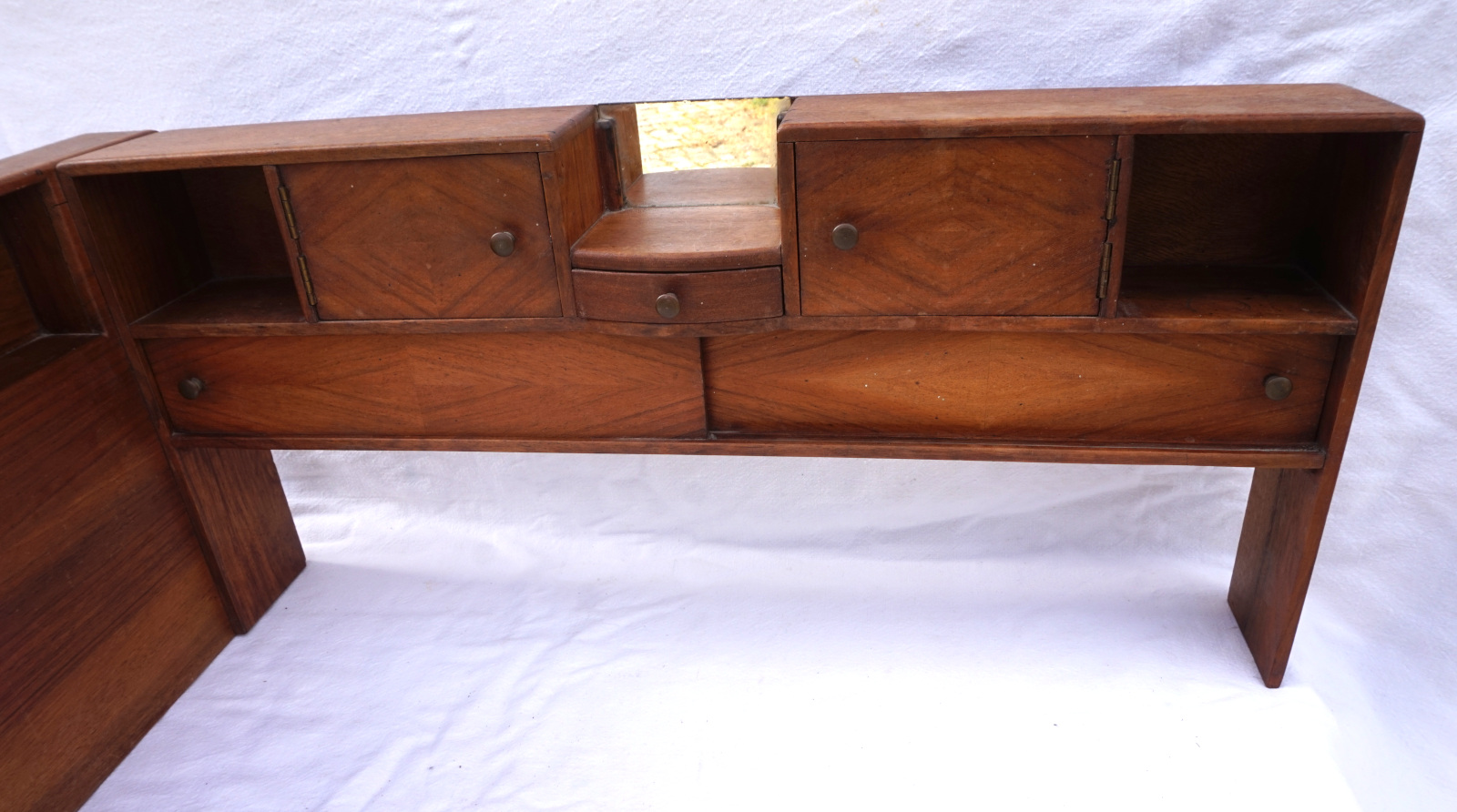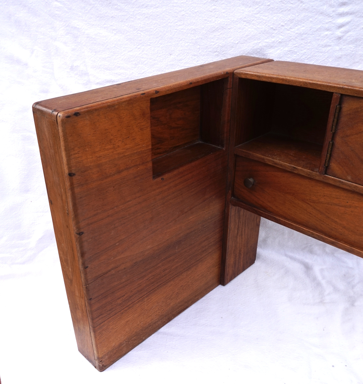 Tête de lit d'angle à tiroir et placards, vers 1960. Hauteur 29 cm, longueur 62.2 cm, profondeur 8.5 cm, pour le retour longueur 29.7 cm, profondeur 4.5 cm, poids 2.2 kg. Très bel état.