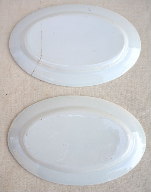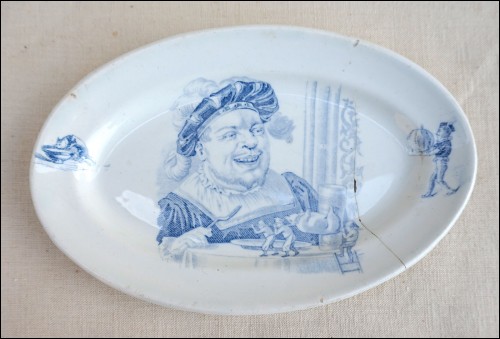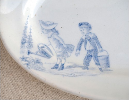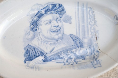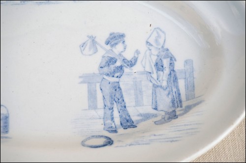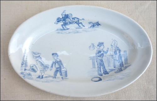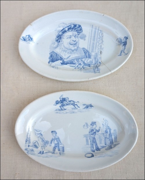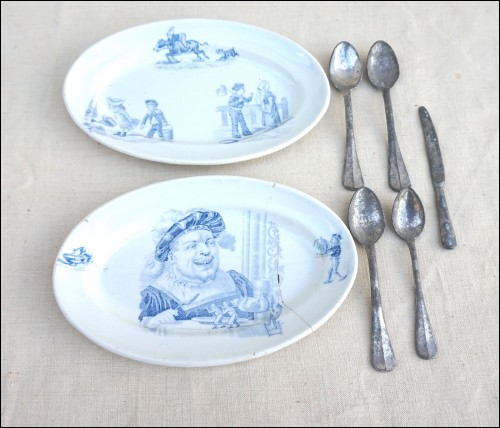 French doll dinnerware transferware faience doll pair of oval dishes showing the story of Guargantua made during the end of 19th century. The dishes come with 4 aluminum spoons and one knife. 6 1/2" length 4 1/4" width for the dishes.One dish is repaired and the aluminum flatware are rustyas presented on the following pictures.