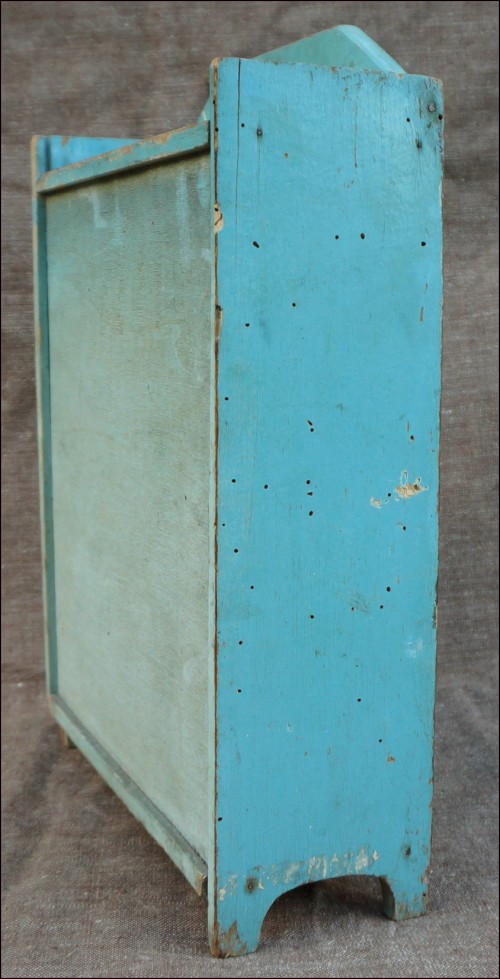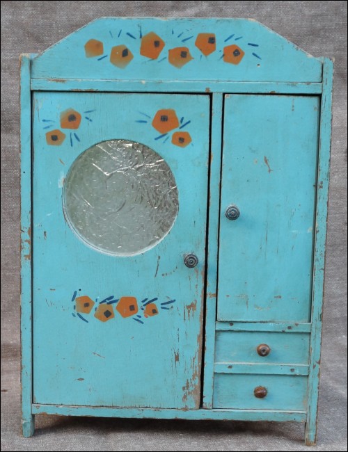 French Art Deco doll armoire or wardrobe in painted wood with aluminum paper for mirror, false drawers and 2 doors made during the 1940's. Good condition , 2 knobs are not originals. 15 3/8" high 11" width 4" depth.