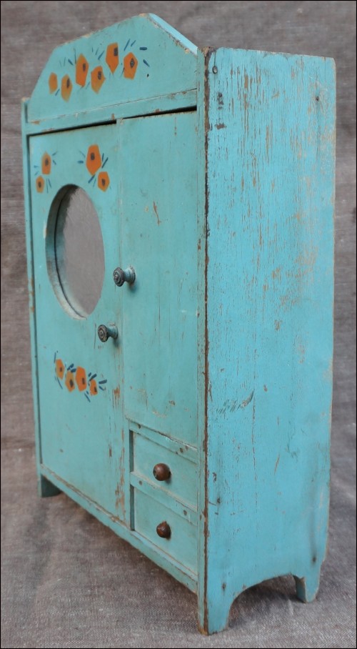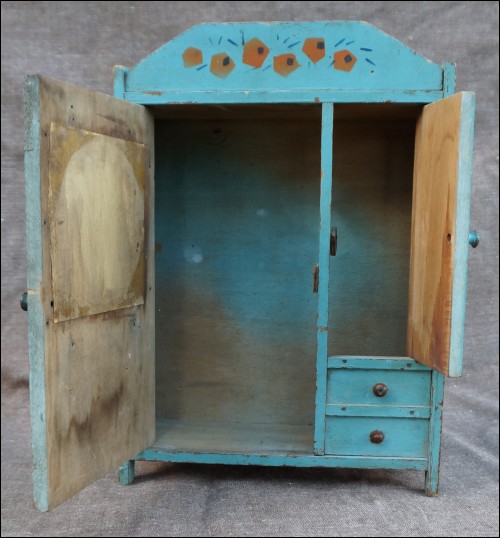 Armoire de chambre de poupée, époque Art Déco. Peinture d'origine, miroir en feuille d'aluminium, faux tiroirs, boutons en l'état, traces de xylophage traitées. Hauteur 39 cm, largeur 28 cm, profondeur 10 cm.