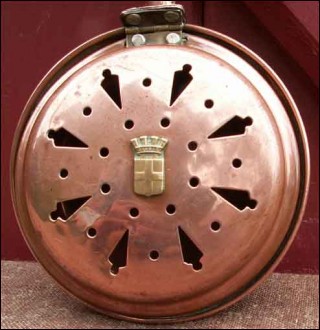 Petite bassinoire de lit pour la maison de poupée, elle porte un écusson en laiton aux armes de Savoie et est faite en souvenir de Valloire. Hauteur 35.7cm diamètre 10.5cm. Bel état.